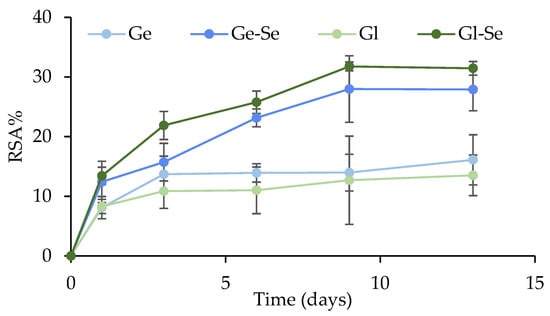 The antioxidant activity of the electrospun scaffolds was measured using the DPPH assay and expressed as radical scavenging activity (RSA%) over a time period of 13 h (Figure 9). Overall, scaffolds show an RSA% increase over time, with differences between Se NP-doped and undoped fibers. In particular, scaffolds containing Se NPs (Ge-Se and Gl-Se) show significantly higher RSA% values compared to their undoped counterparts after 3 h of incubation. This enhanced activity increases up to approximately 8 h, with final RSA% values of about 30%. These profiles are consistent with the presence of Se NPs, as selenium has redox properties capable of scavenging free radicals, thereby attenuating oxidative stress [41,42].