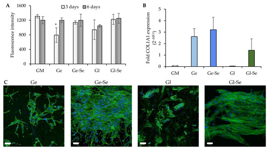 NHDF proliferation (A) expressed as fluorescence intensity (FI) after 3 and 6 days of contact with the electrospun scaffolds (mean values ± s.d., n = 5); * indicates significant differences against GM. Relative gene expression level (B) of COL1A1 (mean values ± s.d., n = 3); one-way ANOVA; Scheffé test (p ≤ 0.05): GM vs. Ge, Ge-Se, and Gl-Se; Gl vs. Ge, Ge-Se, and Gl-Se. CLSM images of NHDFs (C) grown onto the electrospun fibers (white bar–scale bar: 50 µm).