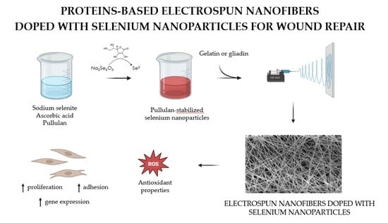 In conclusion, electrospun nanofibers based on gelatin and gliadin doped with Se NPs were successfully designed and developed for wound healing. Pullulan was employed as a stabilizing agent, enabling the synthesis of stable, amorphous Se NPs. Pullulan-stabilized Se NPs, blended with either gelatin or gliadin, were then electrospun, leading to the formation of uniform nanofibers with well-distributed nanoparticles within the individual fibers. Physicochemical characterization showed that the influence of the protein source affected fiber morphology, swelling behavior, surface charge, and mechanical properties. Gelatin-based scaffolds had smaller fiber diameters, greater swelling and hydrophilicity capacity, and better mechanical strength, while gliadin-based scaffolds had larger fiber diameters and greater elasticity. Thermal and TEM analyses confirmed the effective doping of Se NPs within the polymeric fibers. Both gelatin and gliadin scaffolds provided negative surface zeta potential at physiological pH and intrinsic antioxidant activity, which increased significantly after doping with Se NP. In vitro testing confirmed scaffold biocompatibility, and, in particular, fibers doped with Se NPs promoted better fibroblast adhesion, proliferation, and ECM-related gene expression than undoped scaffolds. These findings demonstrate that the doping of protein-based fibers with Se NPs boosted the scaffold performance, suggesting a potential benefit in tissue repair.
