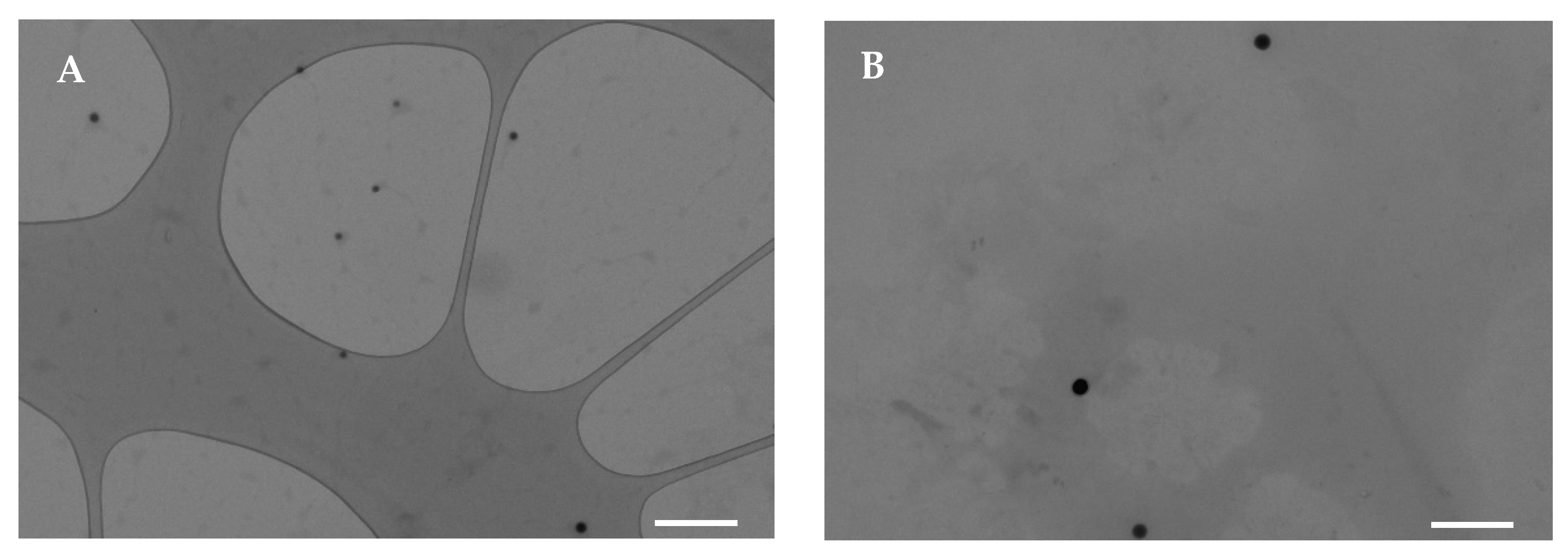 Figure 1 reports TEM micrographs of Se NPs stabilized with pullulan, prepared both in water and in a water/ethanol mixture. Both Se NPs appear as spherical dark spots, with no aggregation, suggesting that pullulan effectively prevents particle coalescence during synthesis. On the other hand, in the absence of a stabilizing agent, Se NPs aggregated rapidly therefore, pullulan plays a crucial role in maintaining colloidal stability.