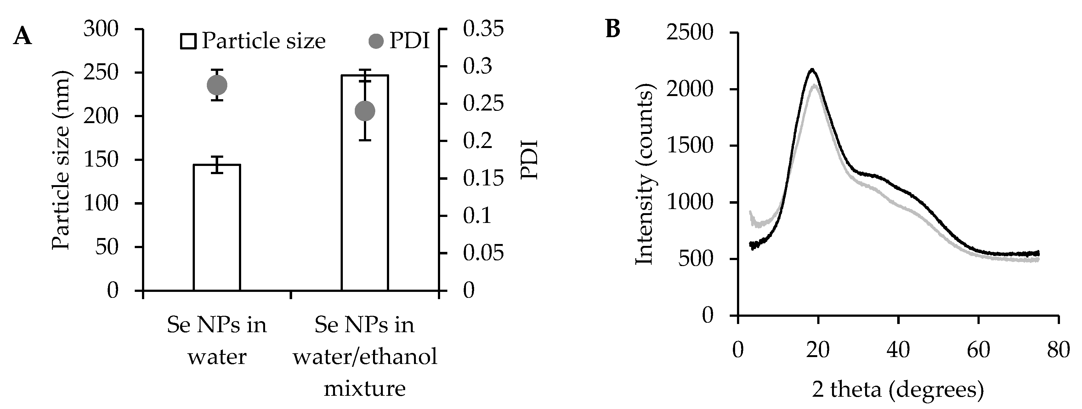 Figure 2B), indicating that the selenium nanoparticles adopt an amorphous state. According to the literature, elemental selenium exists in various allotropic forms, including two amorphous phases (red and black) [