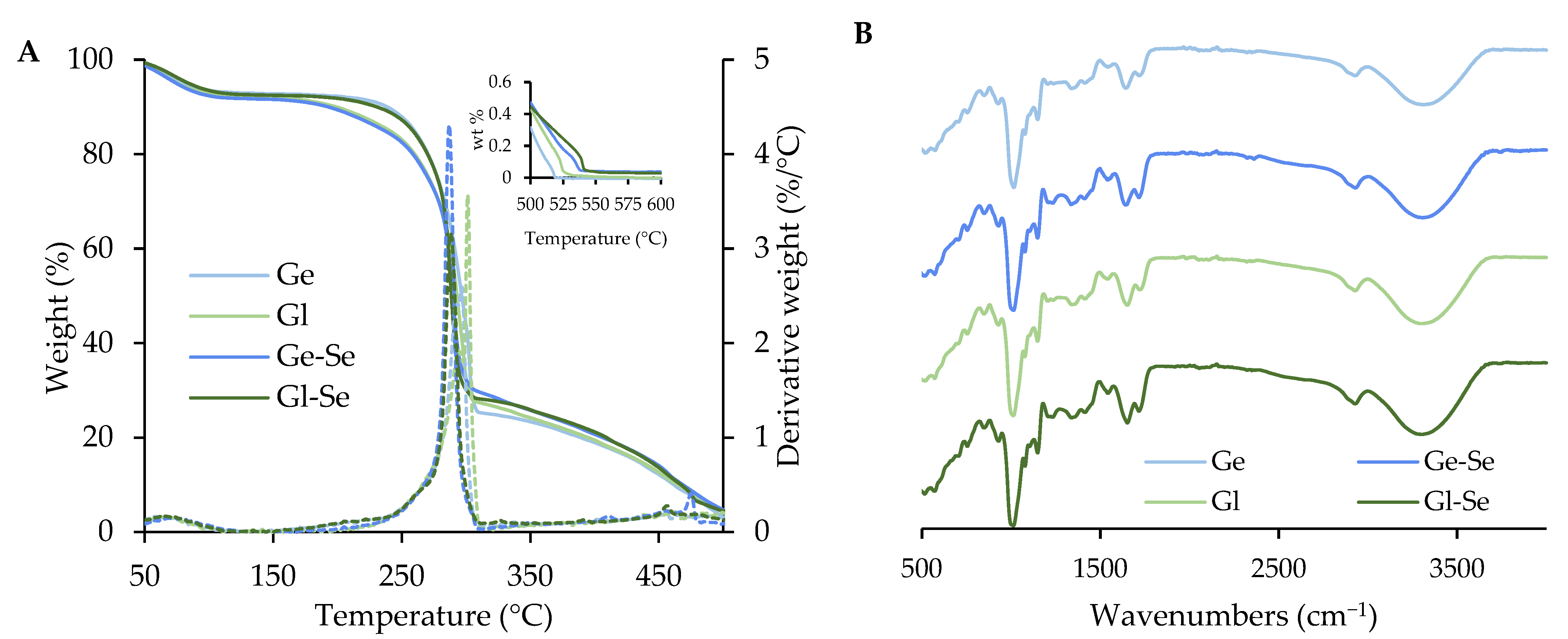 Figure 5A. The thermograms reveal three stages of degradation. The first weight loss of approximately 10% occurs between 40 °C and 110 °C and is related to the evaporation of adsorbed and bound water (peak temperature: 75–85 °C). The second stage represents the main degradation event, which begins around 160–170 °C and peaks at about 300 °C (peak temperature: 285–300 °C). During this stage, the scaffolds lose about 75% of their mass due to the thermal decomposition of the organic matrix, resulting from cleavage of peptide bonds, degradation of side chains, and the release of volatile low molecular weight fragments. The third stage, starting at around 300 °C and extending up to 520–550 °C (peak temperature: 450–475 °C), involves the degradation of more stable carbonaceous residues. This phase leads to the complete decomposition of organic matter in the undoped scaffolds. However, in the Se NP-doped scaffolds (Ge-Se and Gl-Se), a residual mass of about 0.04% can be appreciated and persists beyond 550 °C. As this residue is not present in the undoped samples, it can be attributed to the inorganic selenium component, and this value corresponds to the theoretical selenium content.