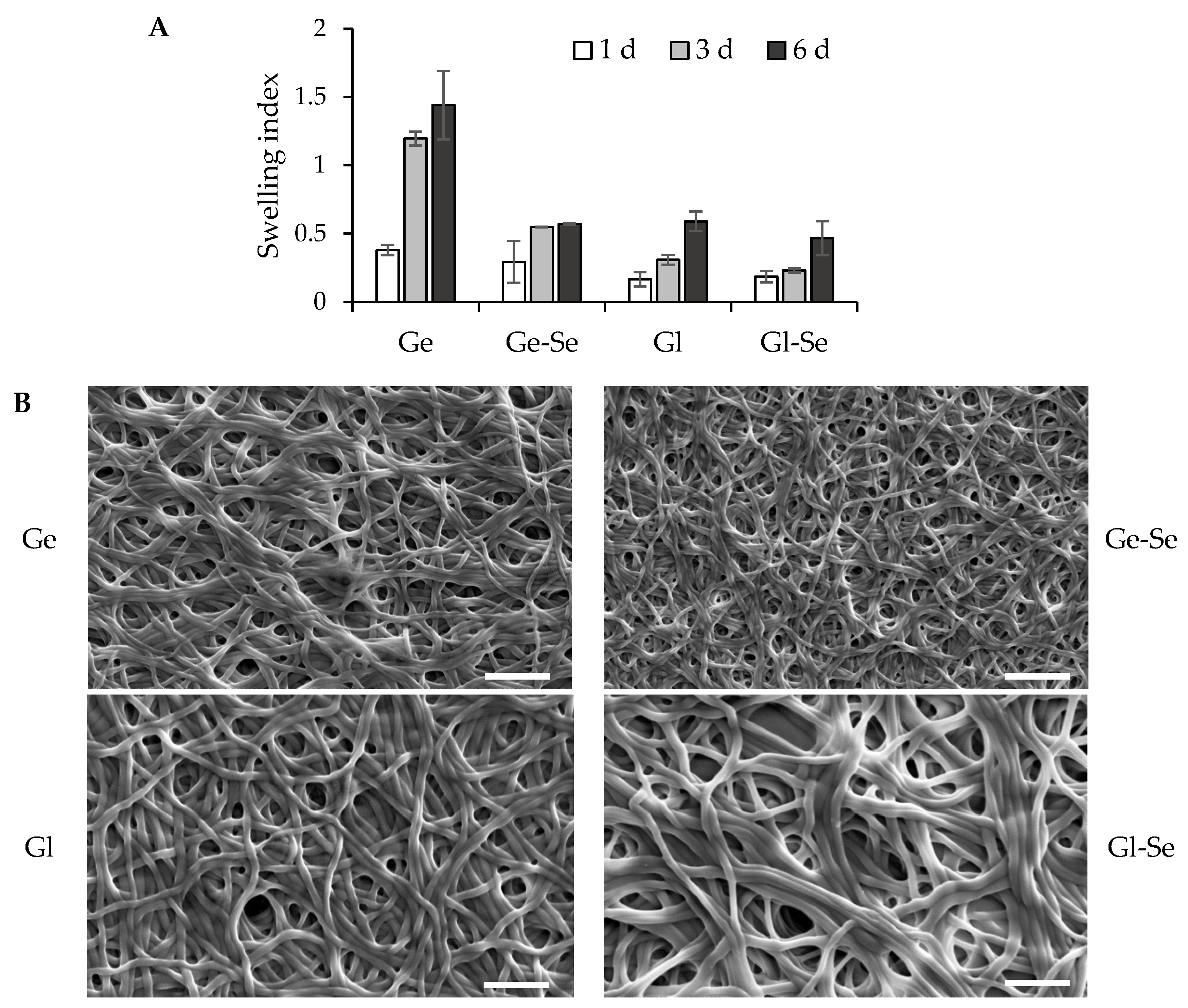 Figure 6A reports the in vitro swelling behavior of electrospun scaffolds, expressed as swelling index (SI), after 1, 3, and 6 days of incubation in PBS at 37 °C, to evaluate the scaffold’s ability to absorb fluids and preserve its structure after implantation into the lesion. Gelatin-based scaffolds without Se NPs (Ge) show a marked swelling profile, with SI values up to 1.4 after 6 days of hydration. In contrast, gelatin-based scaffolds doped with Se NPs (Ge-Se) have significantly lower swelling capacity, reaching a maximum SI of about 0.5 after 6 days. This reduction could be related to the presence of selenium nanoparticles acting as physical assembly points within the gelatin matrix, which could impair polymer chain mobility and reduce water uptake and matrix relaxation. On the other hand, gliadin-based scaffolds, both undoped (Gl) and doped with Se NPs (Gl-Se), show poor swelling properties, with SI values remaining below 0.6 after 6 days of hydration. This behavior is probably related to the hydrophobicity of gliadin, which is rich in nonpolar amino acid residues. These hydrophobic side chains reduce the protein’s affinity for water, limiting its swelling capacity. In addition, the doping of Se NPs into gliadin fibers does not significantly influence swelling behavior, suggesting that, in this case, the predominant factor in hydration is the hydrophobic nature of the protein matrix. These findings are further supported by SEM analysis (