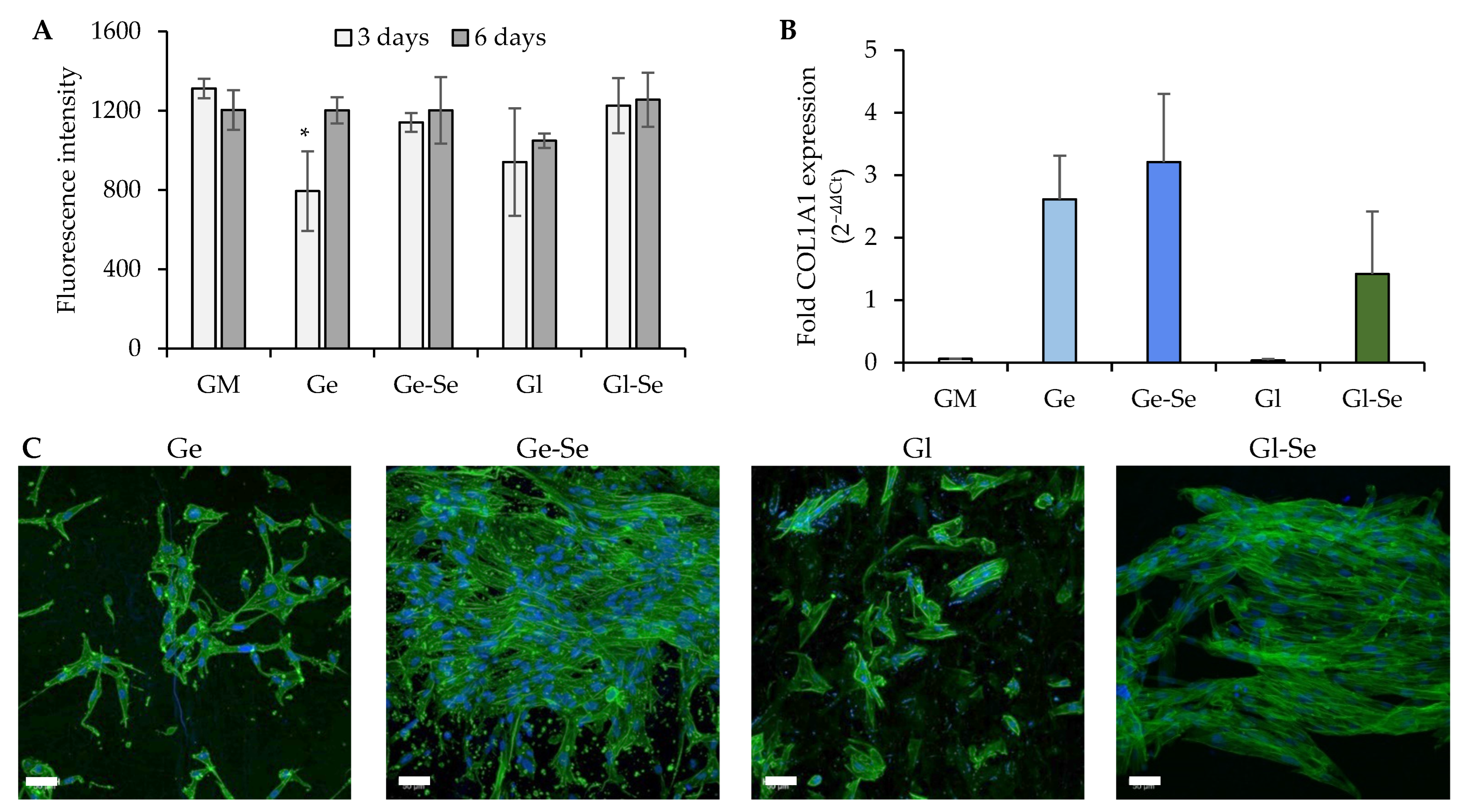 Figure 10B). The highest degree of gene expression is demonstrated by gelatin-based scaffolds, while gliadin-based scaffolds reveal a lower response, with Gl showing negligible expression. The superior performance in stimulating collagen expression from gelatin-based scaffolds compared to gliadin scaffolds could be related to bioactive gelatin sequences that trigger signal transduction pathways related to cell proliferation and ECM remodeling. In contrast, gliadin exhibits limited bioactive motifs and a higher degree of hydrophobicity, which could impair cell adhesion and spreading. However, in both cases, the presence of Se NPs appears to promote collagen expression, highlighting selenium’s ability to provide a favorable environment for cell proliferation [