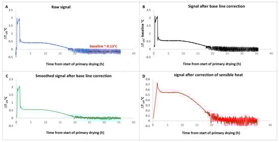 After baseline correction, the ΔT or ΔP signals are often scattered, in general, because of the temperature or pressure regulation systems. Typically, we use an acquisition frequency of one point every 1 to 5 min, and we use a moving average procedure to eliminate most scattering (we use an averaging period of 10 to 20 min, depending on the case). It is only on the corrected signal that Equation (4) is applied for the ΔT method (or Equation (5) for the ΔP method). Figure 1 illustrates the complete procedure for the ΔT method. In Figure 1A, at a time comprised between 25 and 35 h, the signal oscillates around its baseline (~−0.13 °C). In Figure 1B, the signal has been corrected by subtracting the baseline. In Figure 1C, the baseline-corrected signal has been smoothed by applying a moving average (11 min period of averaging), which erases the oscillations without altering the shape of the signal. Finally, in Figure 1D, the impact of the sensible heat has been removed by calculating . Note that the initial small peak in the corrected ΔTI/O signal (Figure 1D) is most probably a calculation artefact due to the approximation mentioned in the theoretical part. Indeed, after the end of the initial heating ramp, when the shelf temperature reaches its plateau, it is for d<T>/dt = 0, and the equipment is still at a slightly lower temperature than the fluid, leading to some residual heat exchange and a peak in the ΔT signal. A more refined procedure to eliminate this peak was proposed in the supplementary information section of reference [12].