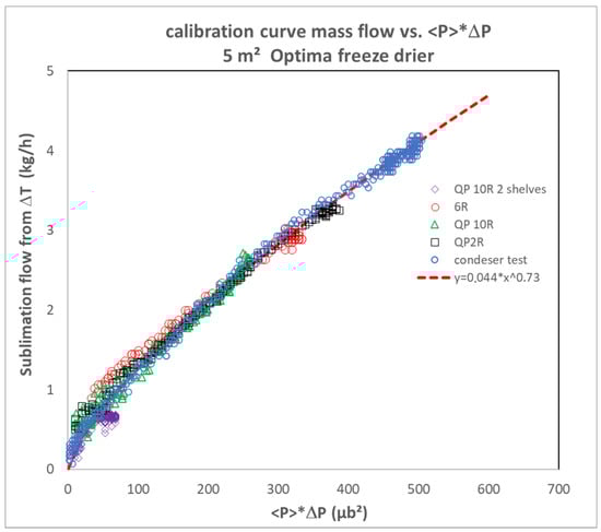 Two methods are proposed by [12]. The first method consists of plotting <P>ΔP as a function of the mass flux determined based on the ΔT method. It is preferable to combine several sets of data acquired at various pressures and to cover a large range of flow rates (Figure 2). The second method consists of first calculating the integral on the basis of pressure data collected for several batches manufactured on a unique freeze dryer under different pressures and with a wide range of loads. Then, the integral is plotted against the sublimated mass of ice. The points align only for the right α value, and the slope of the line is 1/β [12].