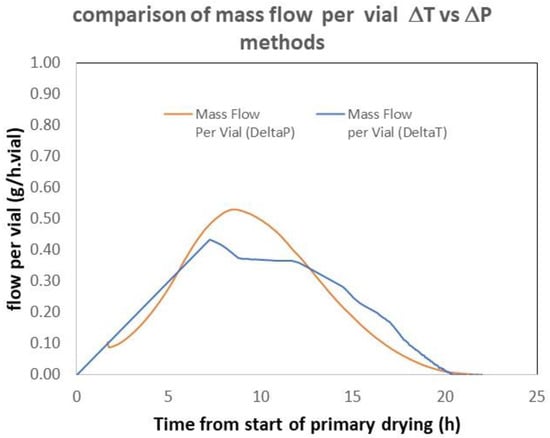 Comparison of the mass flow obtained on a 29 m2 commercial freeze dryer. The ΔP method was calibrated according to the “integral” method. Adapted from reference [12].
