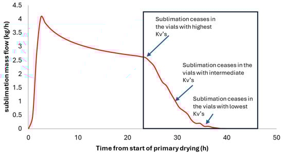 Compared with conventional methods for determining Kv [18,19,20] (where Kv is estimated by the amount of ice sublimated in hundreds of vials over a time interval during dedicated trials), this method offers several advantages. Firstly, there is no need for dedicated testing and cumbersome vial-weighing methodology. The distribution calculation can be performed directly on any batch: technical, clinical, or commercial. For Kv determination at commercial scale [20], this is particularly important, as the immobilization of an industrial installation for Kv measurements by ice sublimation is very costly. What is more, in practice, Kv can only be measured in a restricted sample—at most a few percent of vials—whereas the sublimation flow method offers a global view of distribution. Furthermore, the technique does not require the use of product temperature probes, although this can provide interesting additional information. Figure 5 shows the example of the sublimation mass flow measured by the ΔP method and the distribution calculated based on this measurement (data acquired in a large-scale freeze dryer: IMA lyofast-35 m2).