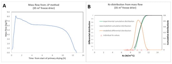 (A) Mass flow for a full load technical placebo lyo cycle (35 m2); (B) cumulated experimental and best fit Kv distributions superimposed with the modelled differential distributions. As product temperature probes were placed in some vials, individual Kv values (triangles) were calculated and plotted for comparison. Adapted from ref [14].