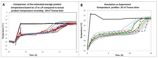 On the other hand, it is possible to use the model developed by [17] based on Kv distributions, provided the cake resistance has been determined. The model allows for calculating the temperature in the different classes and provides the range of expected product temperature profiles. The comparison of the estimated average temperatures or temperature range with measurements taken during the manufacture of engineering batches for which temperature probes were used (Figure 6A,B) shows that the prediction is very close to the measurement. Consequently, measuring sublimation flux using the ΔT or ΔP (or TDLAS) methods enables a software sensor to be set up for product temperature estimation.