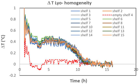 ΔT recording for each of the 15 shelves of a commercial freeze dryer. Shelf 4 was purposely kept empty (technical trial). Note, these data are coming from the same set of data as Figure 6B. The small negative peak around 4 h corresponds to the slow decrease of the shelf temperature from −15 °C to −20 °C. In this specific case, the baseline was not subtracted (cf. Figure 1A).