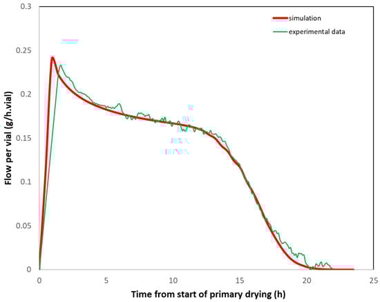 Comparison of the simulated sublimation flux per vial (g/h.vial) based on lab scale data (Kv’s, Rp) and the measured sublimation mass flow at pilot scale (ΔT method). Adapted from reference [17].