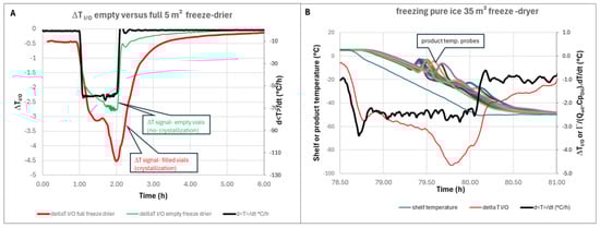 (A) Zoom on freezing (ΔT curve of empty freeze dryer is superimposed for comparison)—5 m2 pilot scale; (B) ΔT (Red) and d<T>/dt (black) superimposed with shelf temperature profile (dark blue) and temperature probes recording (all other curves)-35 m2 industrial scale.