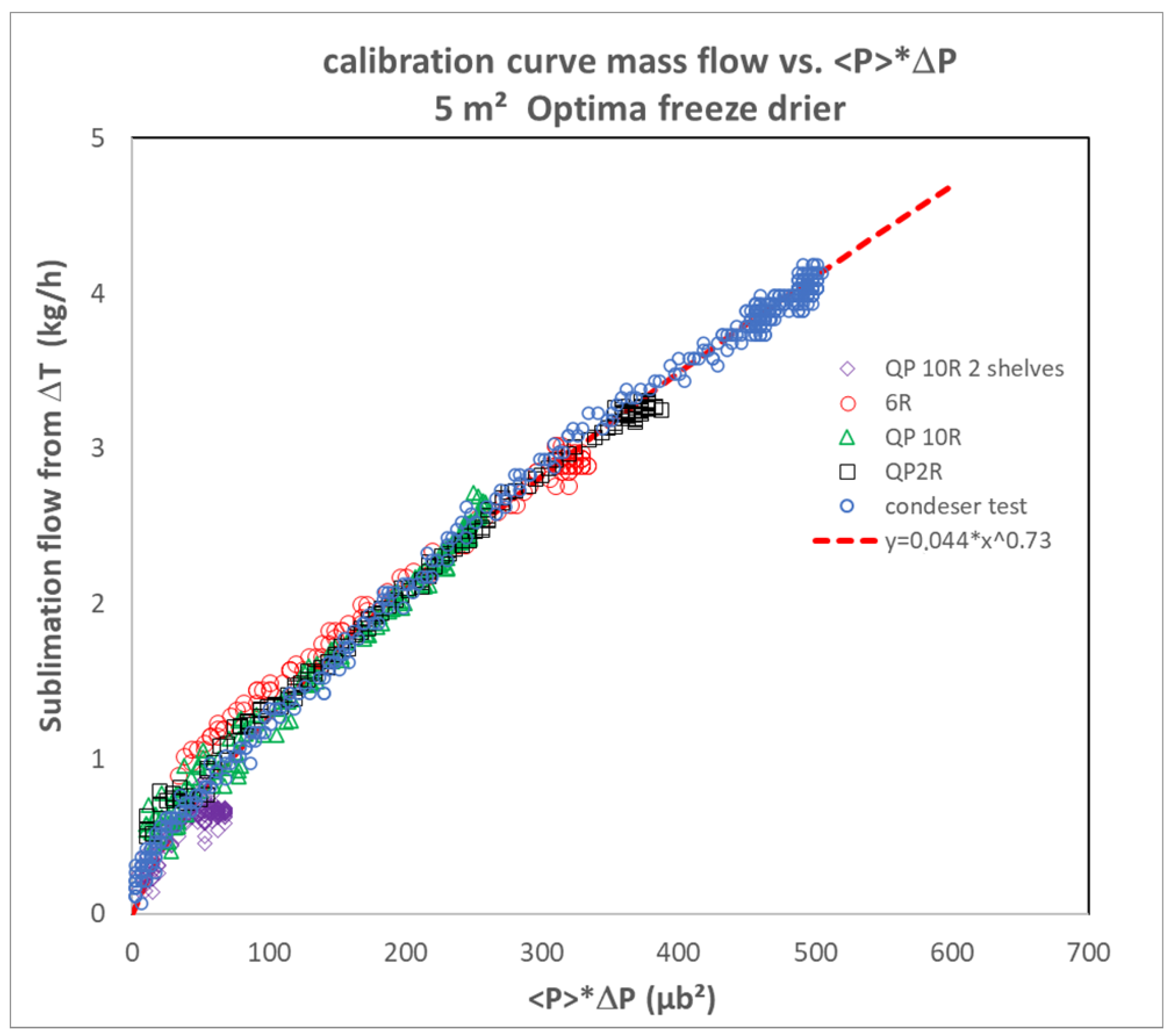Figure 2: This example compares the correlation <P>ΔP vs. mass flow determined by ΔT method for several experiments. (1) The freeze dryer was fully loaded by 2R, 6R, or 10R vials containing pure water (2R, 6R) or an 8% sucrose solution (10R). During primary drying, the pressure was set to 133 µbar and the shelf temperature to −5 °C. (2) Test with 10 R vials in same conditions as (1), but with reduced number of vials (2/6 shelves). (3) Condenser test: 6 trays of water covering the complete shelves (89 kg of water) were loaded in the freeze dryer, and a complete freeze-drying cycle was performed. During primary drying, the pressure was set to 100 µbar. The shelf temperature was raised from −45 °C to 20 °C in 1.5 h and maintained at 20 °C for 65 h, until the trial was stopped after full sublimation of the ice. | |