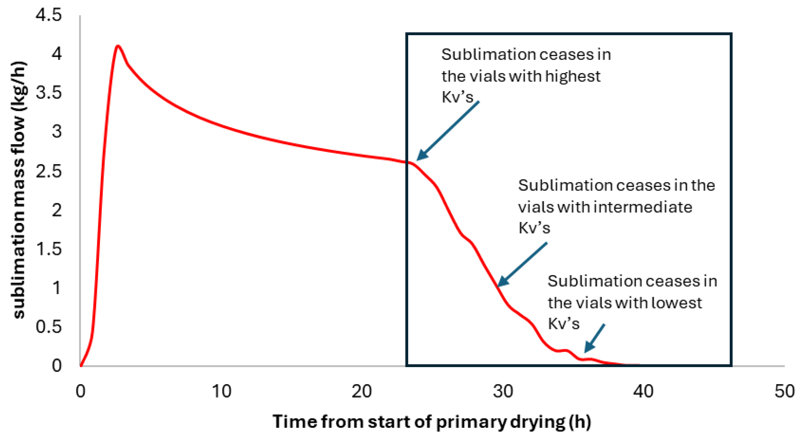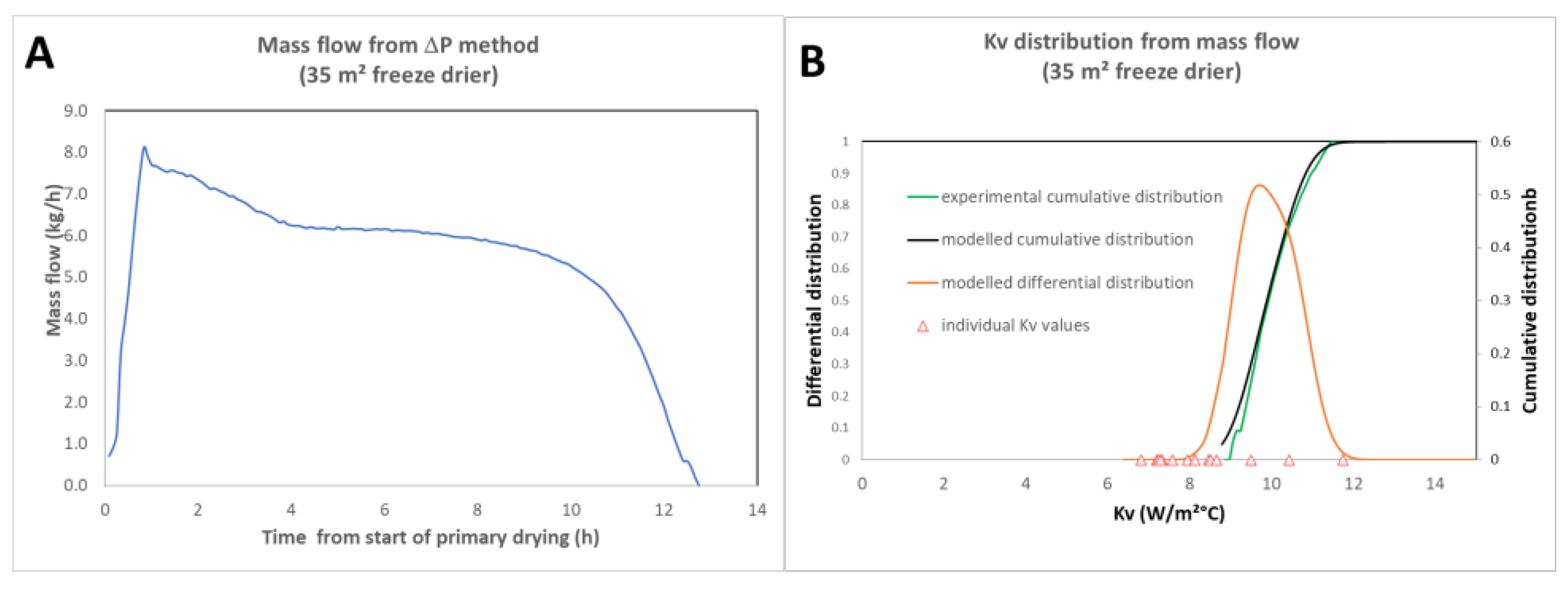 IMA Lyomax 29 29 m2, 13 Shelves | Figure 3: refers to the mass flow measurement according to the ΔP and ΔT methods during the primary drying of the commercial product “A”. Further information is not disclosed. |