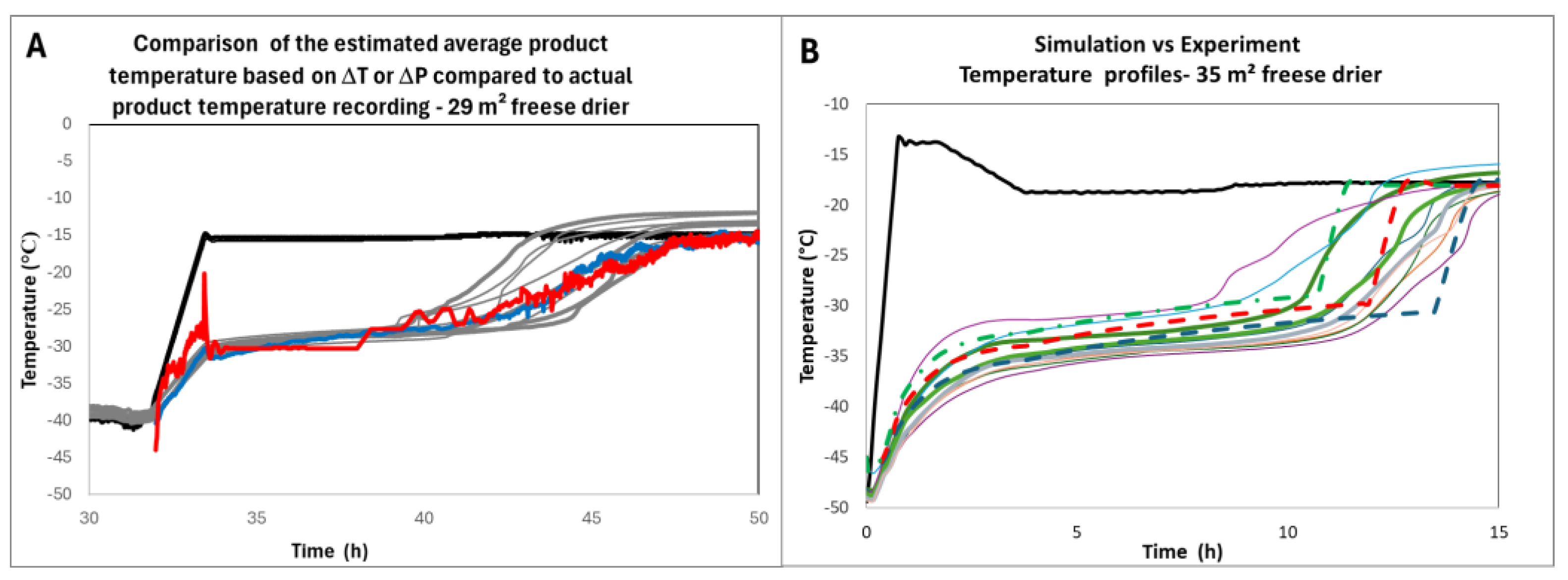 Figure 6A: refers to a technical run of the commercial product “B”. During this non-GMP run, Ellab temperature probes were used to monitor the product temperature. The shelf temperature profile during primary drying is indicated in the figure. Further information is not disclosed. | |
