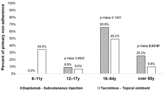 Primary non-adherence to moderate-to-severe AD treatments by pharmacological treatment and age group. Notes: the chi-square test was performed to compare the differences between the two proportions. * The p-value is considered statistically significant if ≤0.05. The p-value is not reported for comparisons where data are not available (i.e., for the 6–11 years age group, where no patients treated with dupilumab exhibited primary non-adherence).