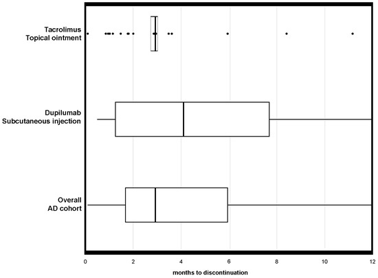 Boxplots of months to treatment discontinuation to moderate-to-severe AD by pharmacological treatments. Notes: the box represents the interquartile range (IQR) with the horizontal line indicating the median value, while the whiskers extend to 1.5 times the IQR beyond the first and third quartiles. Specifically, the boxplot displays the distribution of months to treatment discontinuation within a 12-month follow-up period and includes only patients who initiated therapy, excluding those classified as “spot/non-initiators” in the initiation phase. As such, the plot represents real persistence patterns among patients who started treatment, both for the overall cohort and stratified by administration route of the pharmacological treatment (systemic, namely subcutaneous injection vs. topical, namely topical ointment). The box for the tacrolimus group appears notably small due to the highly concentrated distribution of discontinuation times. Most patients discontinued tacrolimus ointment treatment shortly after initiation, resulting in minimal variability in treatment duration. This limited dispersion produces a compressed box, reflecting overall poor persistence in the tacrolimus-treated subgroup.
