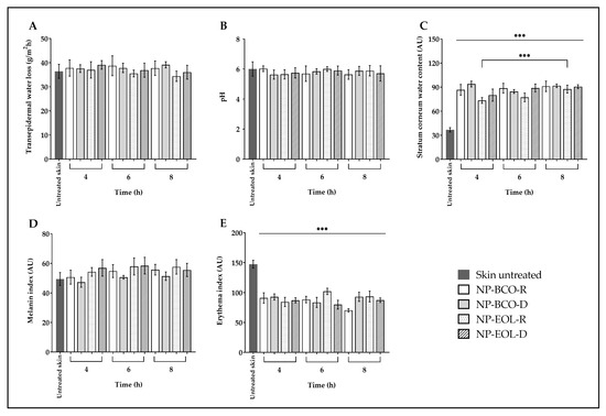 Ex vivo biophysical effect on transepidermal water loss (A), pH (B), stratum corneum water content (C), melanin (D), and erythema (E) after the contact of EOL-loaded NPs compared with untreated skin (mean ± SD, n = 5). *** Indicates significant differences p < 0.001, compared to untreated skin.
