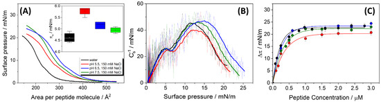 (A) Surface pressure–mean molecular area (–A) compression isotherms of pure HMP1 films spread on water (black) or CBP buffer containing 150 mM NaCl at pH 5.5 (red), 6.5 (blue), or 7.5 (green). Inset: Surface pressure at the first inflection point () in the –A isotherm. The value of obtained for water was significantly different from those at pH 5.5 and 6.5 (p < 0.05), as determined by Tukey’s test following ANOVA. (B) Compressibility modulus, surface pressure curves (-) for HMP1 films, derived from the isotherms shown in panel (A). (C) The maximum change of surface pressure () as a function of peptide concentration () injected on pure water subphase (black) or CBP buffer at pH 5.5 (red), 6.5 (blue), or 7.5 (green). The data represent the average ± standard error of at least three independent measurements. The continuous lines represent the non-linear least-squares regression analysis. All experiments were registered at T = 20 °C.