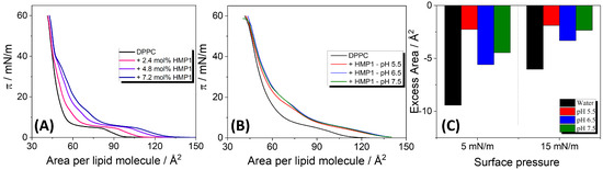 (A) –A compression isotherms for pure DPPC and DPPC co-spread with different amounts of HMP1 onto water at 20 °C. The molecular area corresponds to the total monolayer area normalized by the number of lipids (not considering the peptide). (B) Compression isotherms for DPPC monolayers containing 7.2 mol% in saline solutions (NaCl 150 mM) at different pH and at 20 °C. (C) Excess area calculated from the mixed isotherms of DPPC + 7.2 mol% HMP1 shown in (A,B).