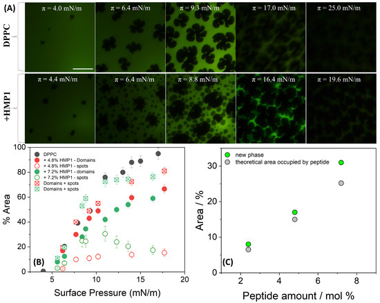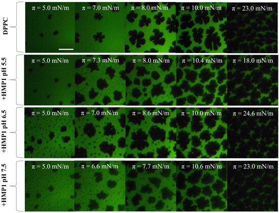 This study demonstrates that the adsorption and packing behavior of HMP1 at the air–liquid interface is strongly influenced by pH and ionic strength, reflecting the sensitivity of its conformation and interfacial organization to charge state and environmental conditions. When mixed with DPPC, HMP1 induces significant morphological changes, including the formation of peptide-associated microdomains, even though the overall area occupied by condensed phases remains comparable to that of pure DPPC monolayers. This indicates that HMP1 reorganizes lateral structure without substantially altering the fraction of the interface engaged in condensed domains.