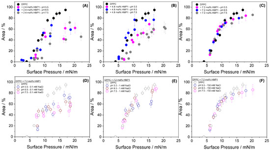 Area occupied by lipid domains plus the new phase (’spots’) at indicated pH in the absence and the presence of 2.4 mol% (A), 4.8 mol% (B), and 7.2 mol% (C) HMP1 as a function of surface pressure. Panel (D–F) shows the area occupied at 0.1 mM NaCl (D), 1 mM NaCl (E), and 150 mM NaCl (F), all at 7.2 mol% peptide and at the indicated pH.