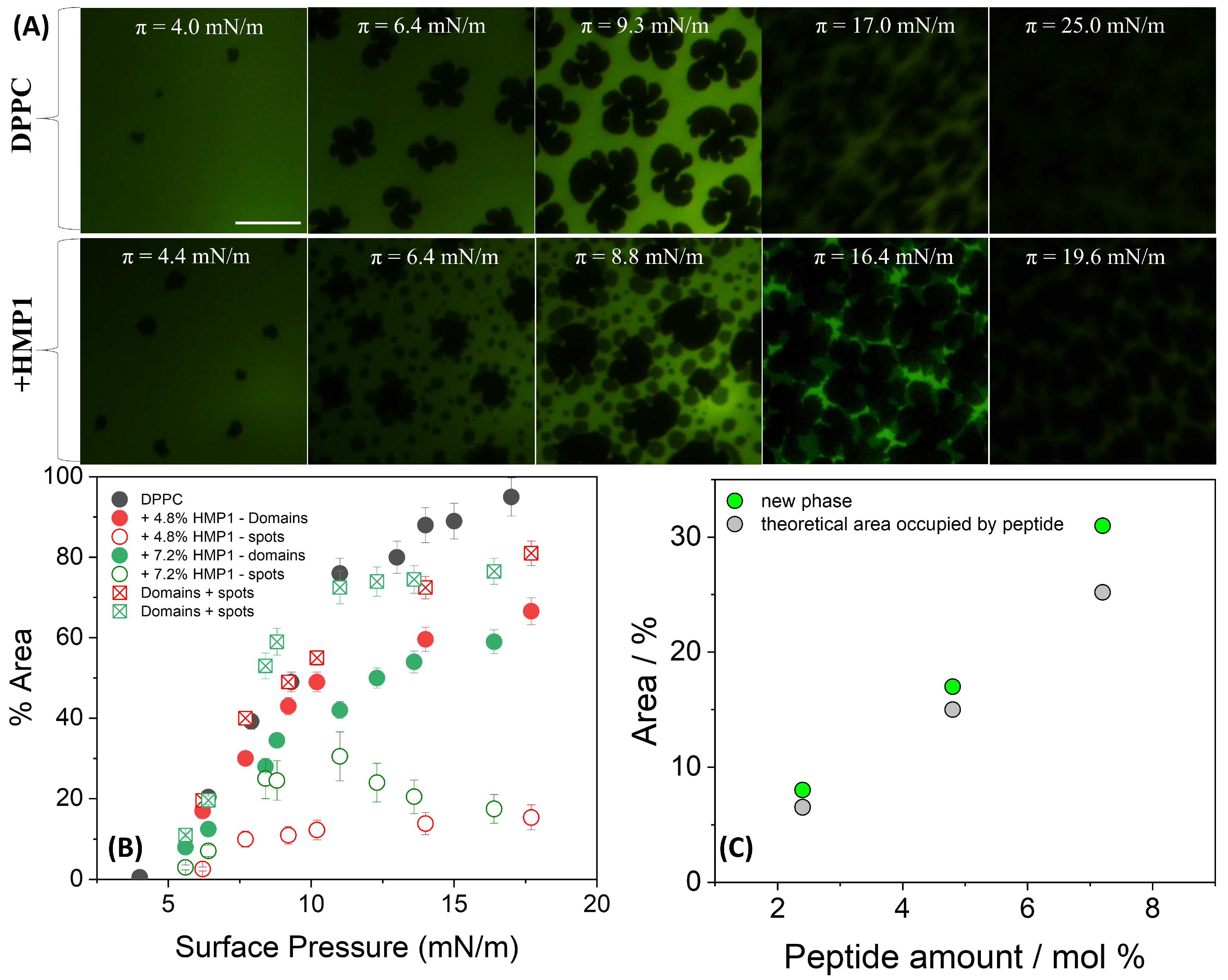 Figure 3. (A) Representative FM images for monolayers composed of DPPC or DPPC + 7.2 mol% peptide spread on pure water at indicated surface pressure and registered during compression at 20 °C. For the images obtained using FM, the monolayer contained 0.5 mole% of NBD-PC fluorescent dye. The scale bar represents 50   µ m. (B) Area occupied by lipid domains (closed symbols) and by the new phase (’spots’, open symbols) at the indicated peptide concentration calculated using FIJI/ImageJ software (National Institutes of Health, Bethesda, MD, USA). The sum of the areas occupied by spots and LC domains is represented by square symbols. (C) Percentage of the area occupied by the new phase (green circles) and the theoretical area occupied by the peptide molecules (gray circles) calculated at 10–11 mN/m.