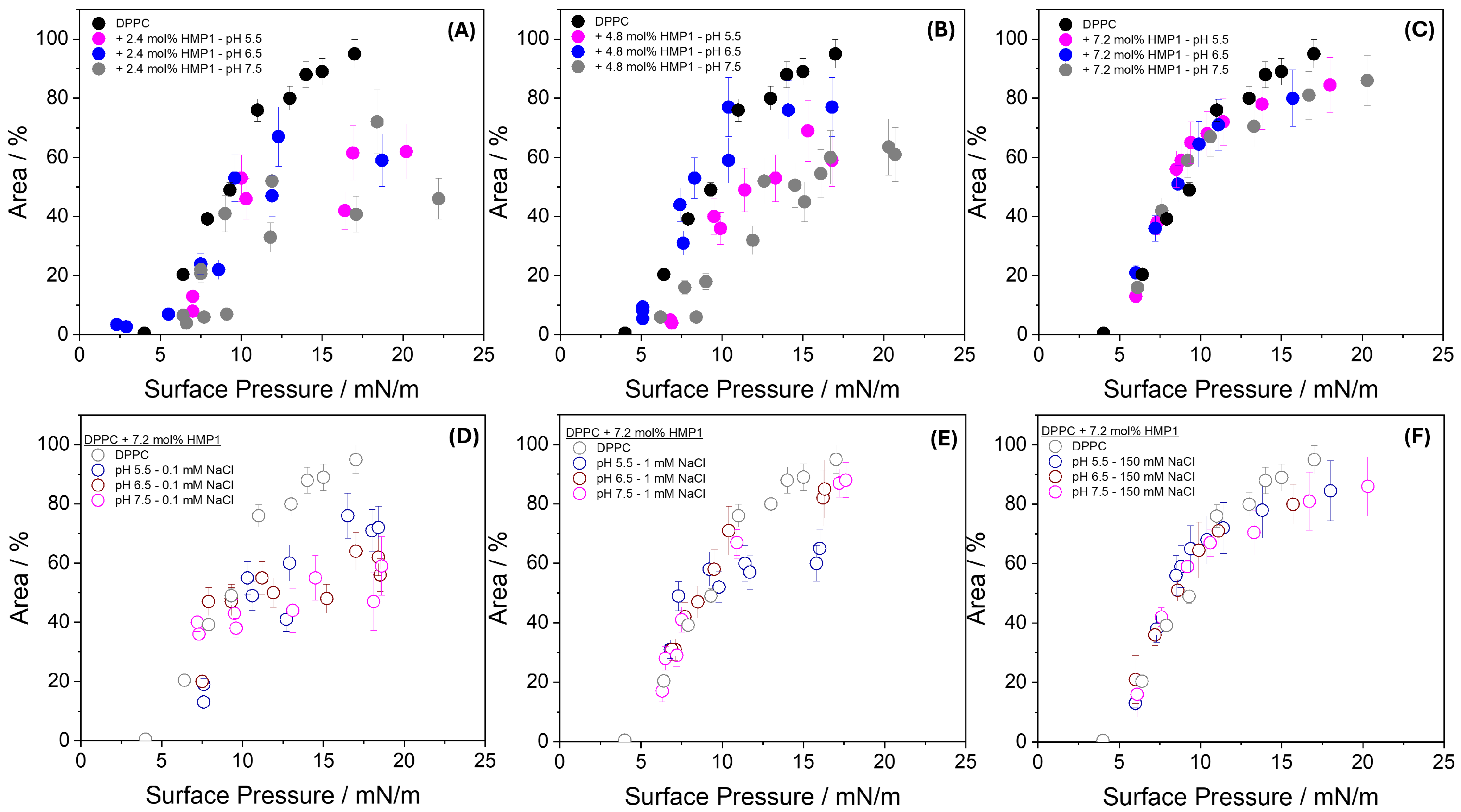 Figure 5. Area occupied by lipid domains plus the new phase (’spots’) at indicated pH in the absence and the presence of 2.4 mol% (A), 4.8 mol% (B), and 7.2 mol% (C) HMP1 as a function of surface pressure. Panel (DF) shows the area occupied at 0.1 mM NaCl (D), 1 mM NaCl (E), and 150 mM NaCl (F), all at 7.2 mol% peptide and at the indicated pH.
