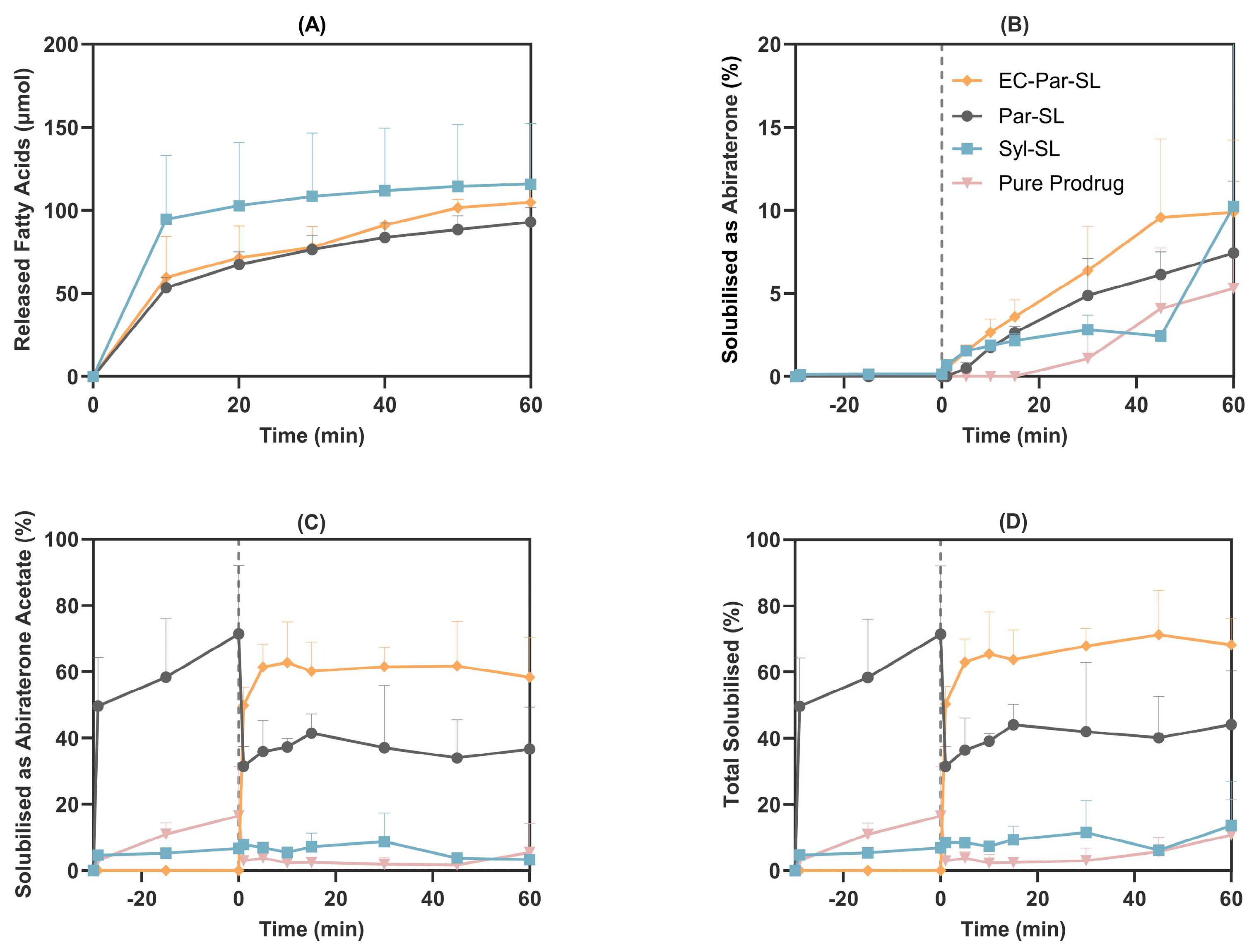 - Taheri, A.; Almasri, R.; Wignall, A.; Schultz, H.B.; Elz, A.S.; Ariaee, A.; Bremmell, K.E.; Joyce, P.; Prestidge, C.A. Enhancing the pharmacokinetics of abiraterone acetate through lipid-based formulations: Addressing solubility and food effect challenges. Drug Deliv. Transl. Res. 2024. [Google Scholar] [CrossRef] [PubMed]