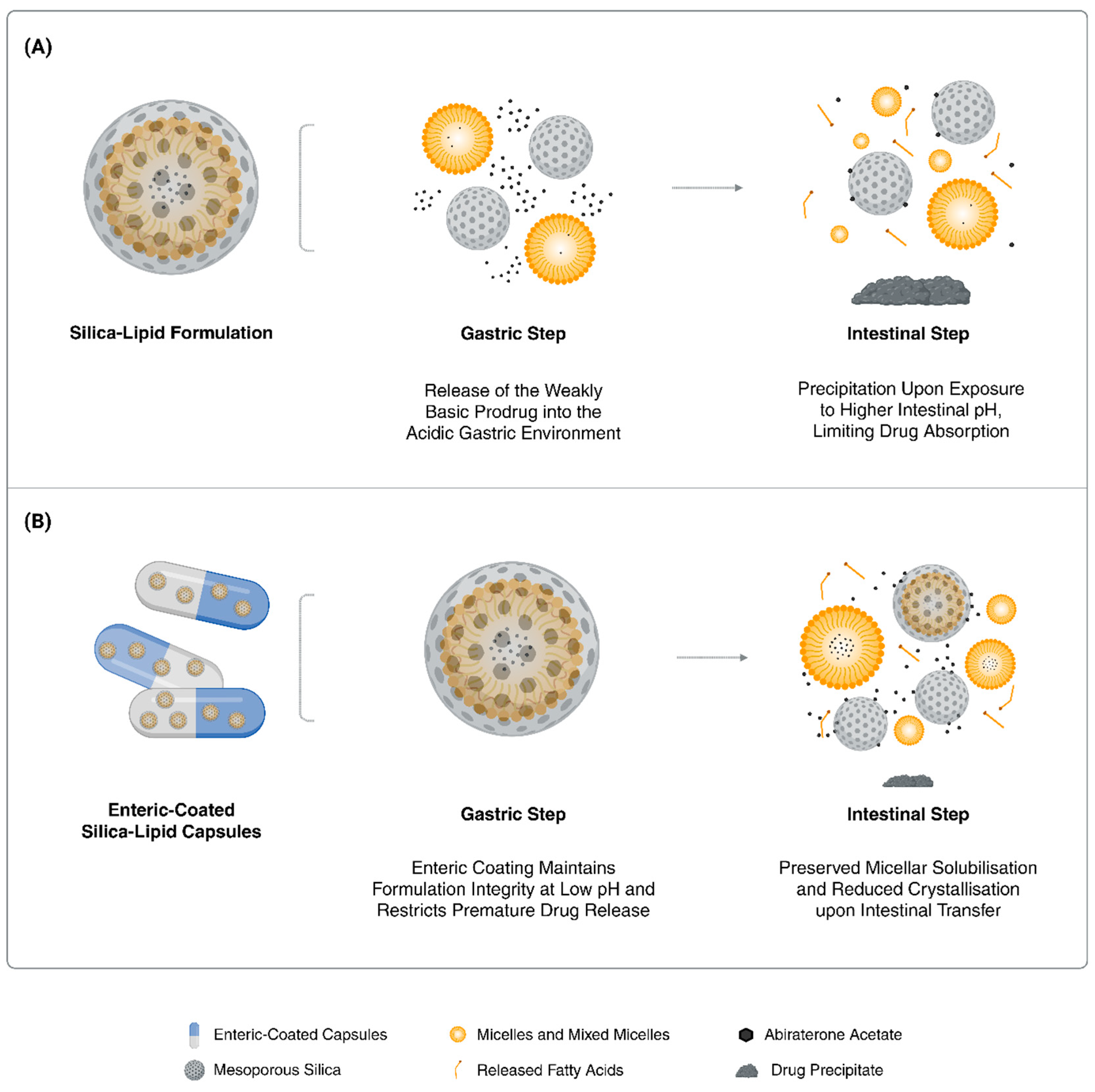 Taheri, A.; Almasri, R.; Wignall, A.; Feltrin, F.; Bremmell, K.E.; Joyce, P.; Prestidge, C.A. Enteric Coating Enhances the Biopharmaceutical Performance of a Silica–Lipid Formulation of Abiraterone Acetate. Pharmaceutics 2025, 17, 1289. https://doi.org/10.3390/pharmaceutics17101289