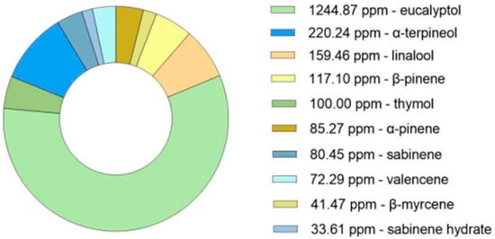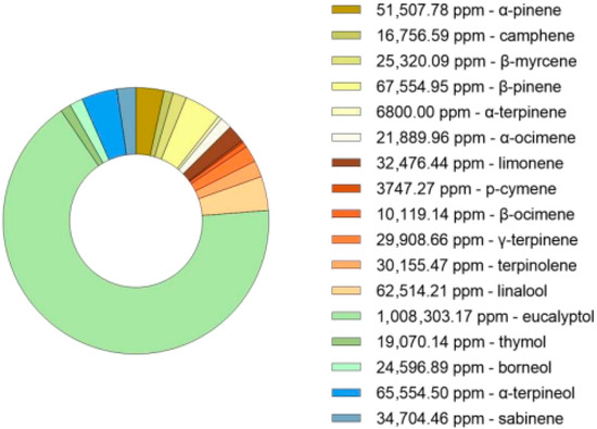 GC-MS analysis of the dried Thymus mastichina plant material was conducted to obtain a comprehensive profile of its terpene composition. This analysis enabled the precise quantification of individual compounds, with concentrations expressed in parts per million (ppm), facilitating accurate detection of trace-level constituents (Figure 1). As anticipated, eucalyptol was identified as the predominant terpene in the sample. This critical analytical step helps establish the phytochemical profile of the dried plant, forming the foundation for subsequent experimental stages.
