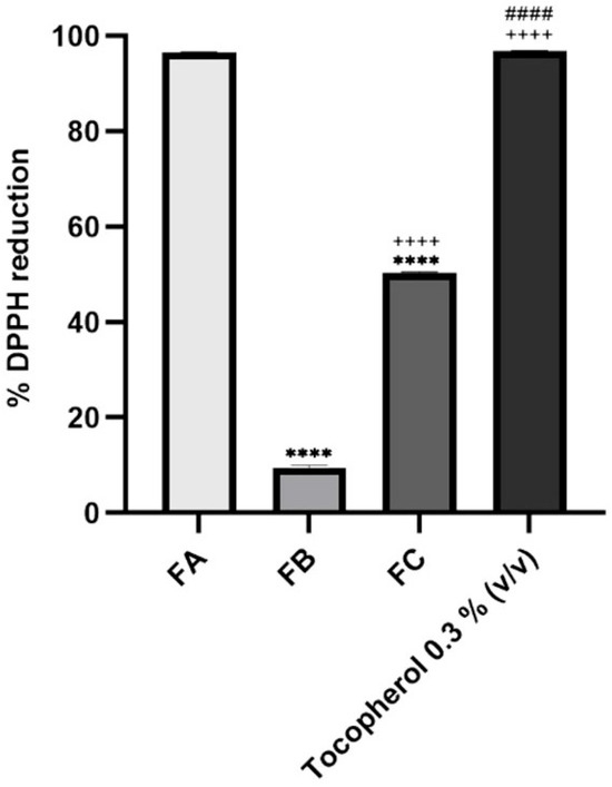 Antioxidant activity of FA, FB, and FC. The positive control, tocopherol, was used at 0.3% (v/v). The concentration tested for each fraction of interest was 10% (v/v). Results correspond to mean ± S.D. (n = 2). One-way analysis of variance (ANOVA), followed by Tukey’s multiple comparisons test (p < 0.05), was used to make comparisons between all the samples. **** p < 0.0001 compared to FA; ++++ p < 0.0001 compared to FB; #### p < 0.0001 compared to FC.