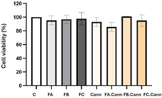 For the in vitro antiproliferative activity, HaCaT cells were seeded at a concentration of 2 × 104 cells/mL (200 μL per well) in 96-well plates and incubated for 24 h to facilitate their adherence [27]. In the following day, the complete culture medium was removed, and fractions FA, FB, and FC isolated or in combination with Cann at 12.5 μM. Cells incubated with only complete medium, were used as negative control representing 100% of cell viability. Twenty-four hours after incubation, the complete culture medium was removed, cells were washed twice with PBS pH = 7.4 and 50 μL of MTT solution (0.5 mg/mL) in incomplete medium was added in each well. Cells were then incubated at 37 °C with 5% CO2 for a period of 2–4 h. After this time, 200 µL of dimethyl sulfoxide (DMSO) was added to solubilize the formazan crystals formed upon reduction of MTT. Subsequently, the absorbance was measured at 570 nm using a BioTek ELx800TM microplate absorbance reader (BioTek Instruments, Inc., Winooski, VT, USA). According to the following equation, the cell viability was determined: