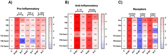 Importantly, while these fractions alone modulated inflammatory gene expression to varying degrees, their combinations with CBD and CBG significantly enhanced anti-inflammatory outcomes. FB.Cann was particularly effective, showing the greatest downregulation of IL-6, TNF-α, and IL-36G, likely due to synergistic interactions between cannabinoids and oxygenated monoterpenes such as eucalyptol and α-terpineol. FC.Cann provided consistent, though milder, anti-inflammatory effects, maintaining moderate activation of PPARγ and supporting homeostatic recovery. FA.Cann also exhibited strong immunomodulatory benefits, attenuating FA’s pro-inflammatory effects and rebalancing receptor gene profiles. At the gene level, the combinations influenced not only cytokine expression but also endocannabinoid receptors. FA alone upregulated GPR55, CNR1, and CNR2, suggesting an unresolved inflammatory state. In contrast, FB.Cann and FC.Cann effectively suppressed GPR55 and enhanced CNR2 expression, reinforcing their roles in immune modulation and tissue repair.