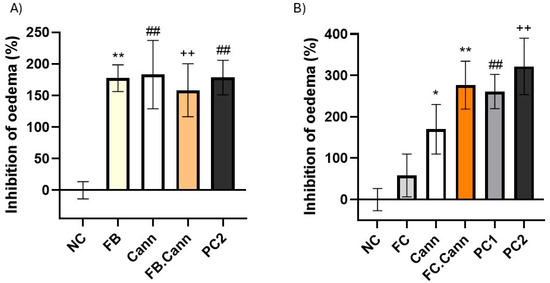 The in vivo efficacy assessment of the formulations was performed using male Wistar rats, supplied from Instituto de Higiene e Medicina Tropical (IHMT) (Lisbon, Portugal). Animals were kept in polypropylene cages at room temperature (20–24 °C) with a relative humidity equivalent to 55 ± 10% and a 12 h cycle of light and darkness. They received standard food and water ad libitum and all experimentation was conducted in accordance with the recommendations of the Animal Welfare Organ (ORBEA) of the Faculty of Pharmacy, Universidade de Lisboa, and approved by the competent national authority, Direção-Geral de Alimentação e Veterinária (DGAV) and in accordance with the EU Directive (2010/63/EU) and all the relevant legislation, including the Portuguese legislation (DL 113/2013, 2880/2015, 260/2016 and 1/2019) for the use and care of animals in research. The anti-inflammatory activity of selected formulations was performed using the carrageenan paw oedema model [1,37]. To carry out this experiment, rats were randomly divided in different groups: negative control, positive controls (two formulations in clinical use—a cream containing a cannabinoid or a diclofenac sodium). The formulations under study were FB, FC, Cann, or combinations of FB or FC with Cann. At least 3 rats per formulation were used. The animals were anesthetized by intraperitoneal injection of a mixture of ketamine at 75 mg/kg and medetomidine at 50 mg/kg. Each formulation under study was applied in the right hind paw of each animal. For the preparation of each formulation, 5% (w/w) of the respective formulation was used and 1% (w/w) of a lipid-based absorption promoter was added as a way of reducing the volatility of the essential oil fraction with and without F1.Cann It should be noted that the amount applied of each formulation, as well as the commercial formulations, were similar among all the animals. The negative control was constituted by animals that did not receive any treatment as a way of representing their basal state. Paw oedema was induced by a single subplantar injection of 0.1 mL of -carrageenan (1%, w/v) sterile saline solution, 30 min after topical application of all formulations under study in the right hind paw as well as to negative control animals. The volume of the paws was measured before the topical application of the formulations and carrageenan injection (V0) and 4 h later (V4), using a plethysmometer (Ugo Basile, Gemonio (VA), Italy). Oedema inhibition was determined according to Equation (4).