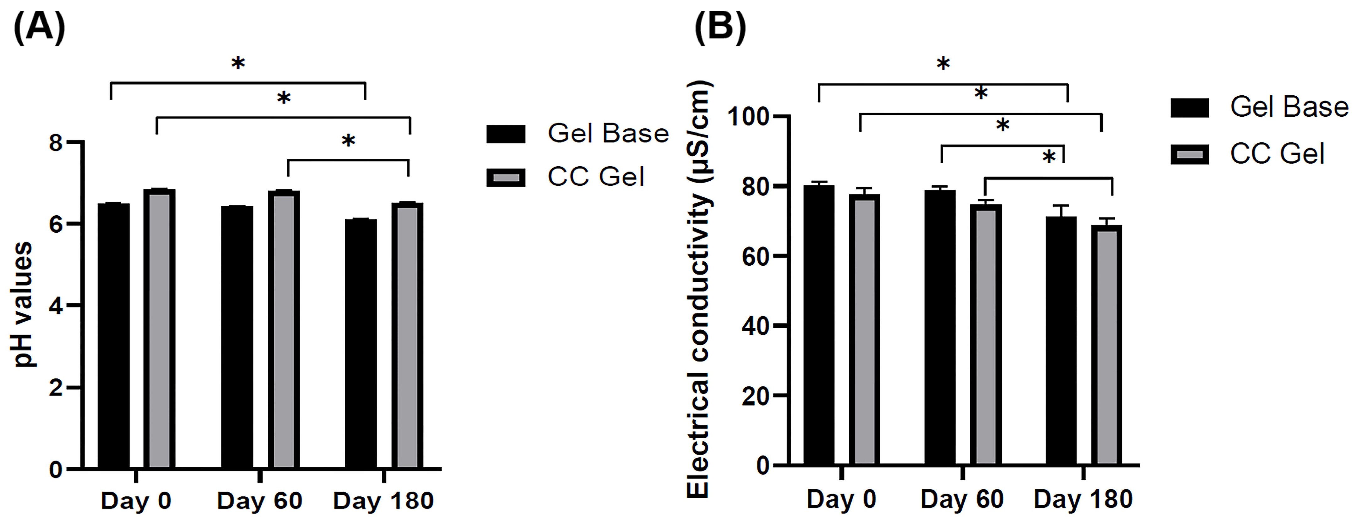 3.3.1. Organoleptic Characteristics and Physical Appearance of the CC Gel