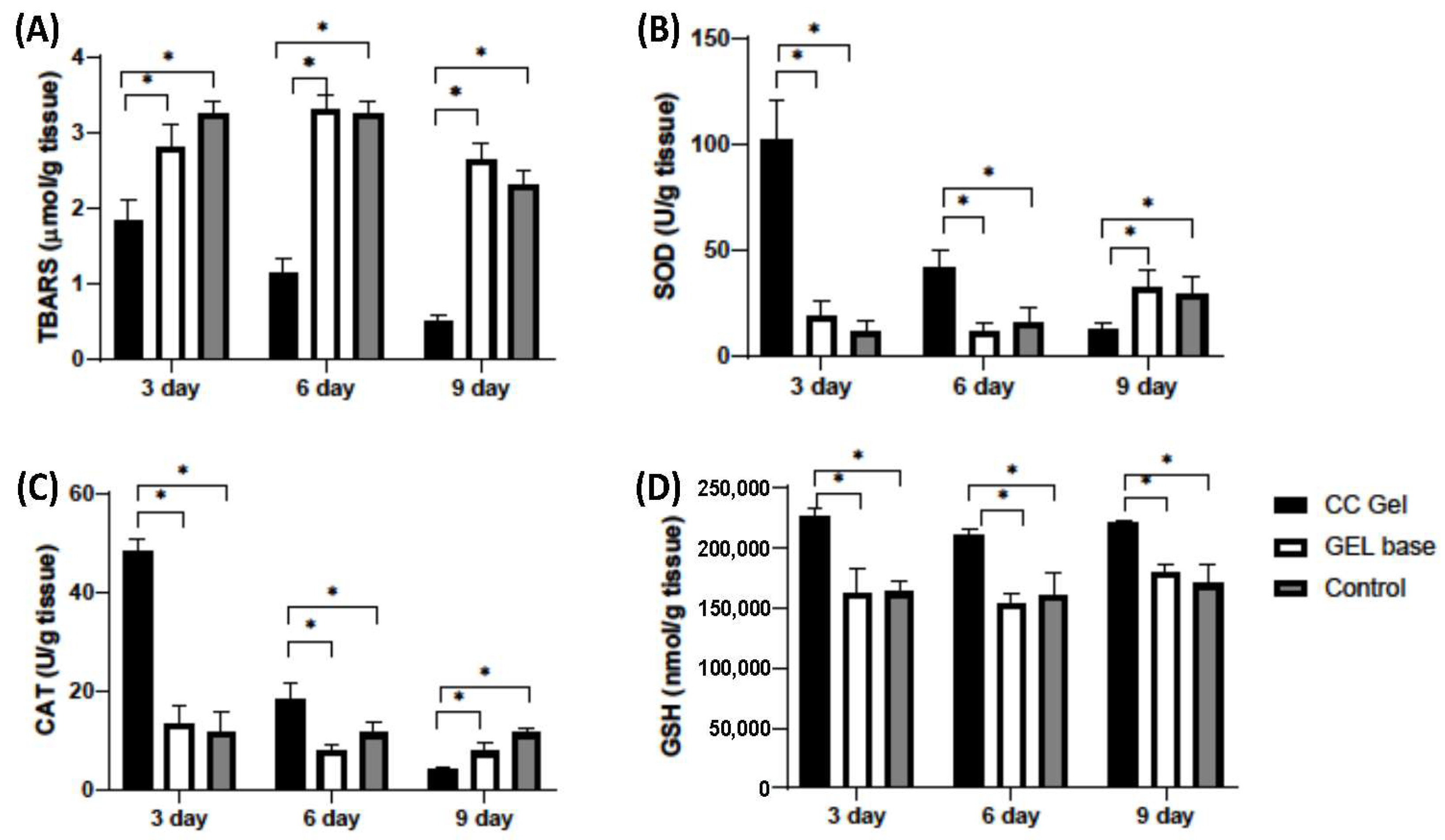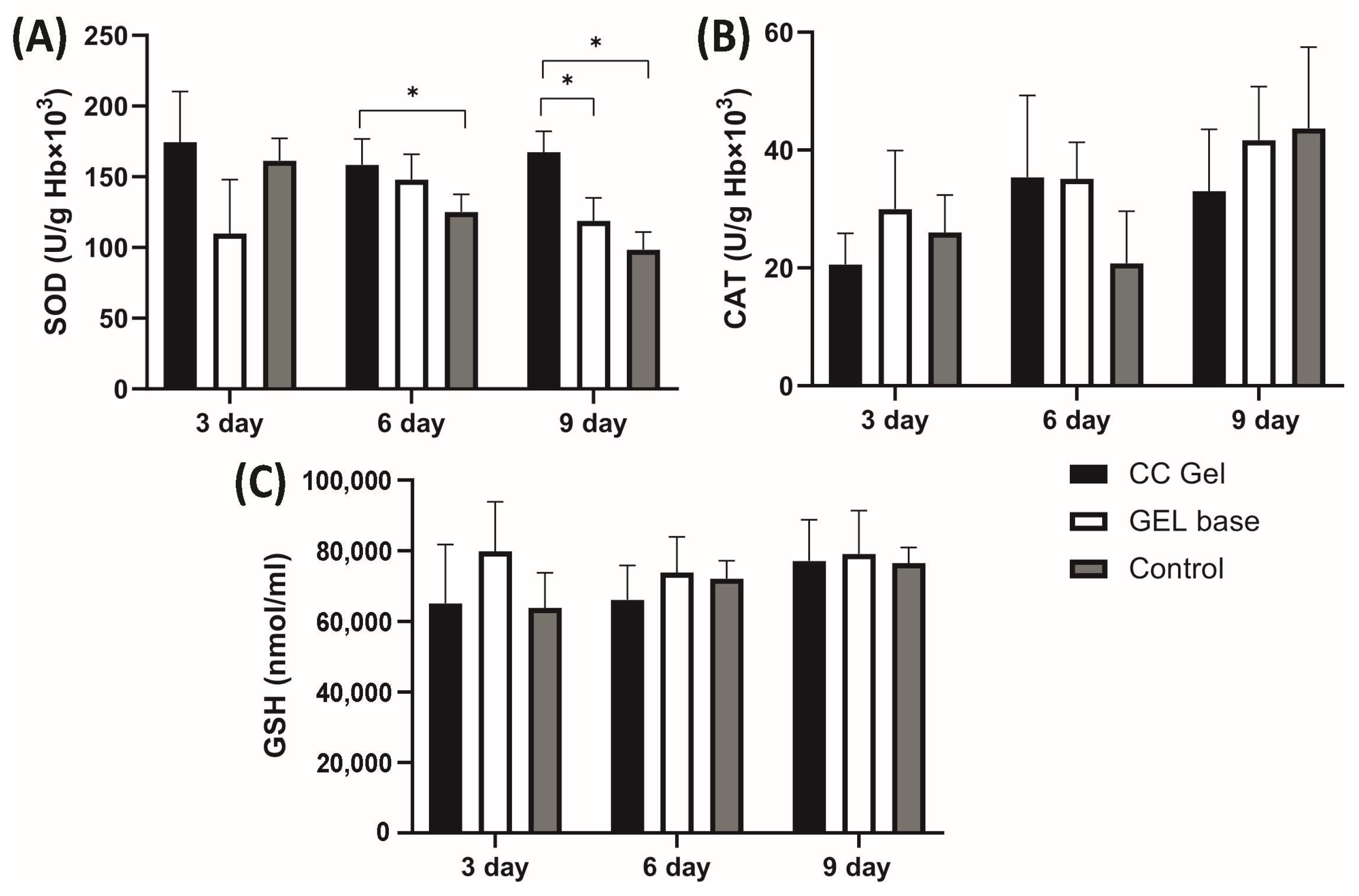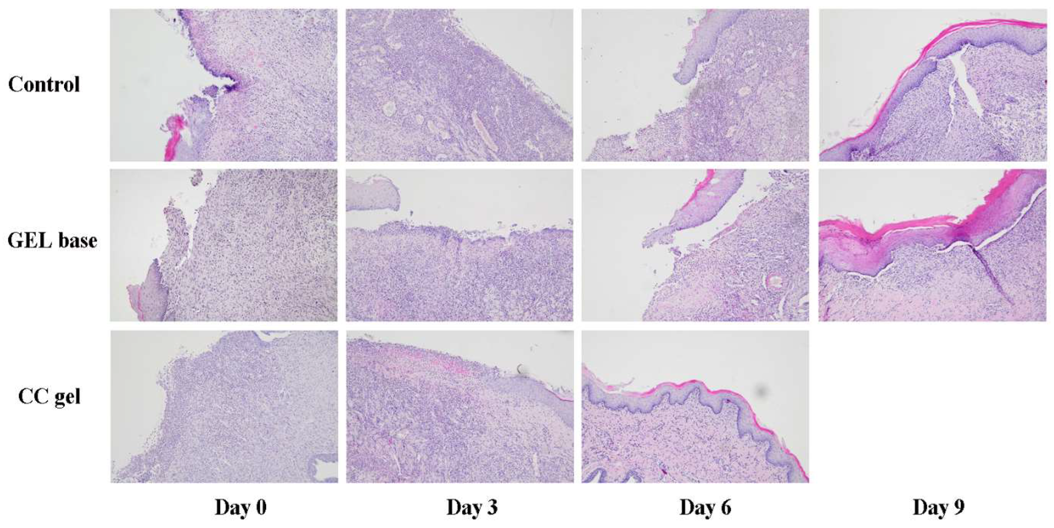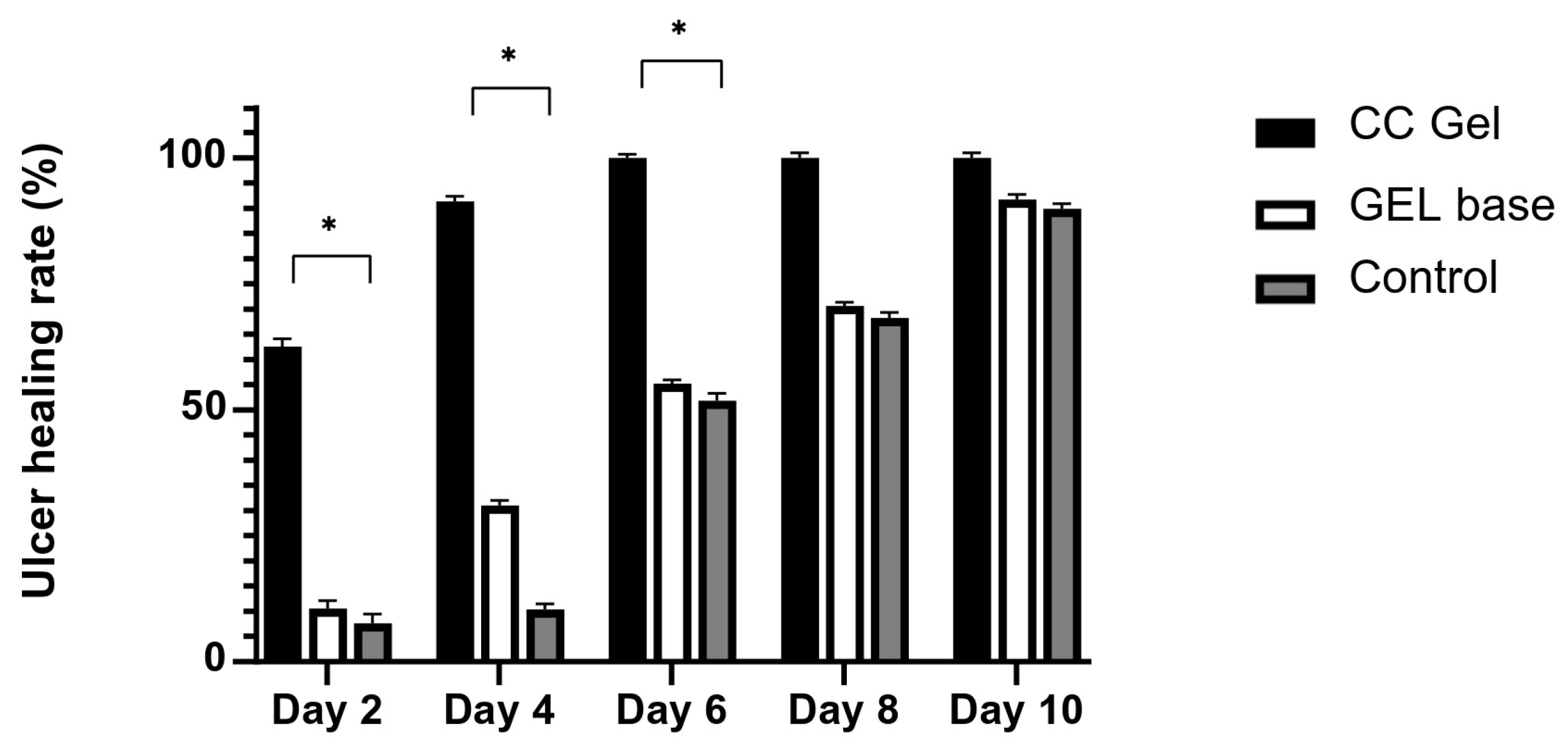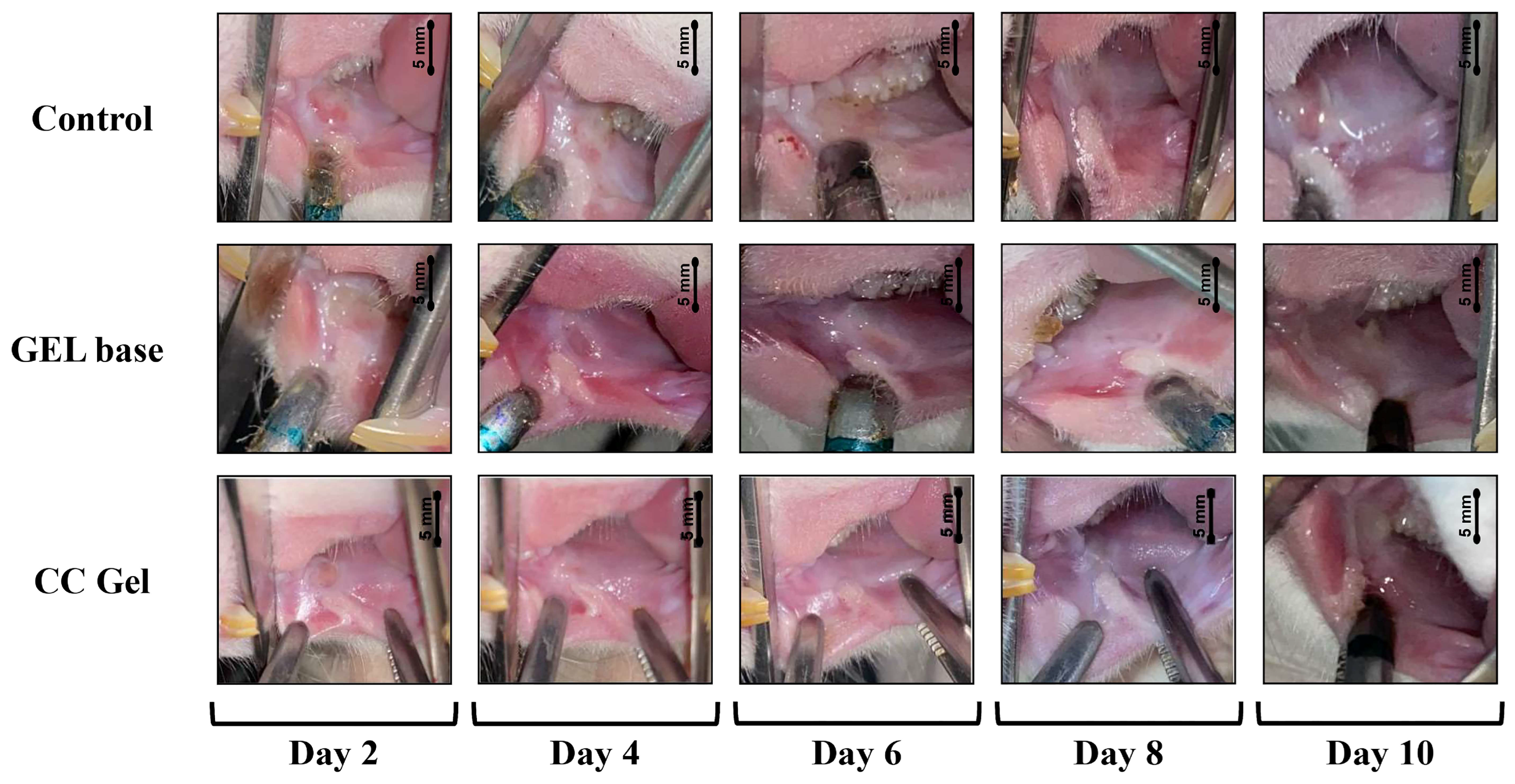 3.4. In Vivo Oral Ulcer Healing Potential of CC Gel