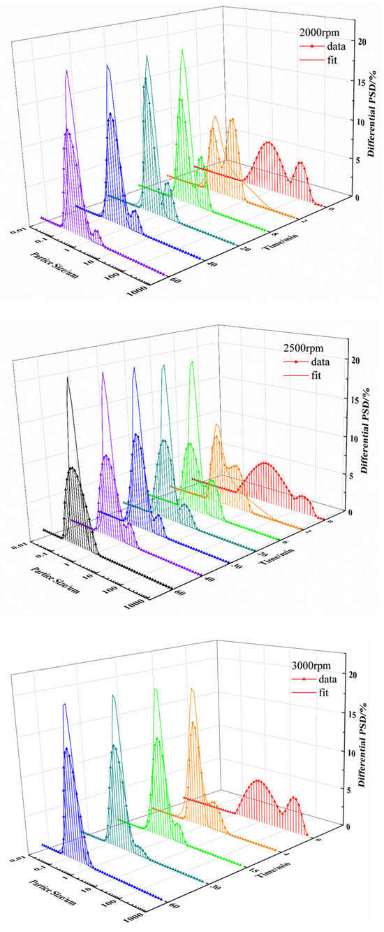 The population balance model was used to simulate the revolution of UA particles during wet milling and to investigate the effect of process conditions, such as grinding speed, on particle size variation. The fitting parameters for the breakage rate kernel and agglomeration kernel are shown in Table 3.