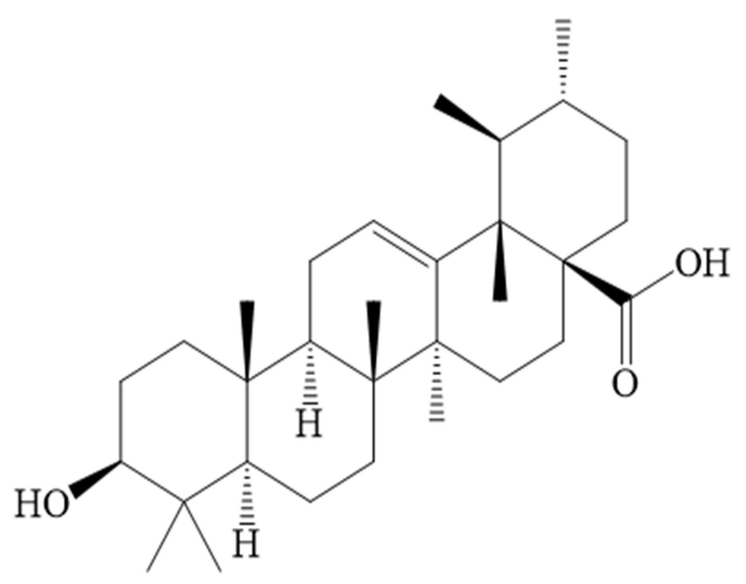 - Pironi, A.M.; de Araujo, P.R.; Fernandes, M.A.; Salgado, H.R.N.; Chorilli, M. Characteristics, Biological Properties and Analytical Methods of Ursolic Acid: A Review. Crit. Rev. Anal. Chem. 2018, 48, 86–93. [Google Scholar] [CrossRef]