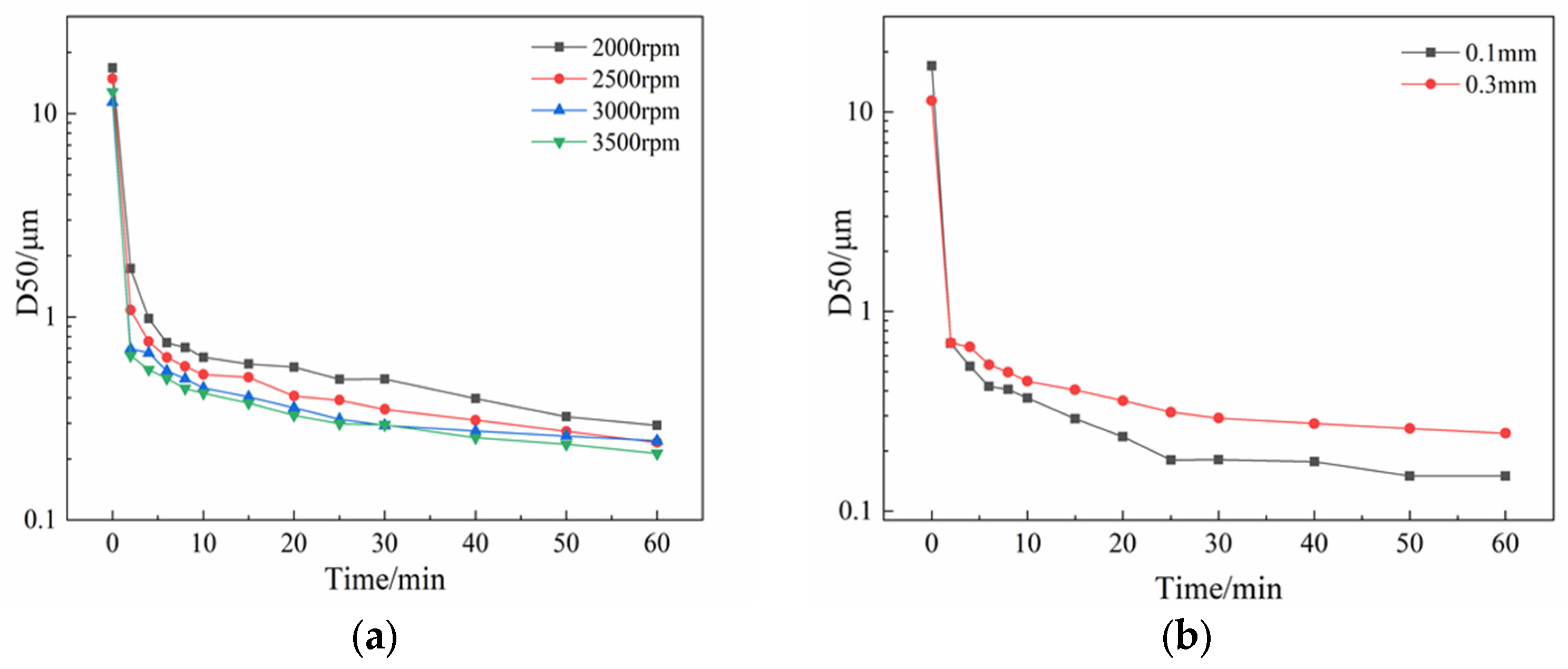 3.1.2. Effect of Grinding Speed and Grinding Beads Size