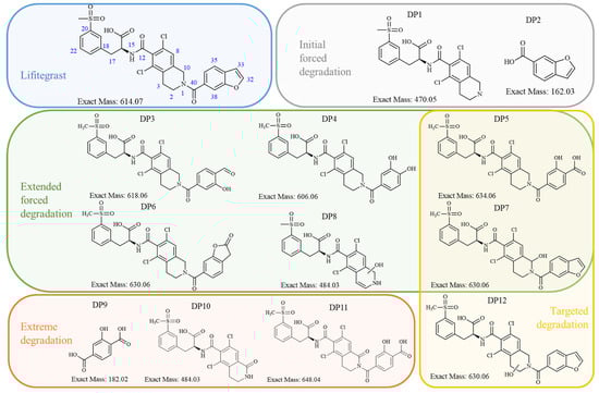 Lifitegrast, its two most common degradation products (DP1 and DP2), and overview of all degradation products discovered within this study (DP3 to DP12), colour coded according to degradation conditions of their discovery.