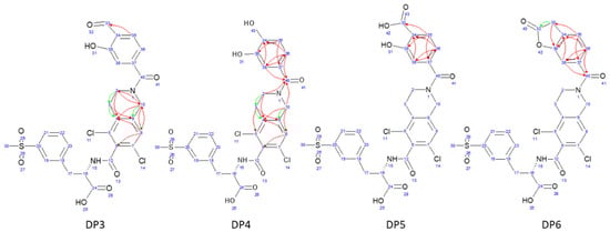 The NMR analysis of the oxidative extended degradation mixture (Supplementary Materials, Section S3.1) revealed at least five compounds structurally similar to LIF (Figures S3–S7). Among these, the structures of DP3, DP4, DP5, and DP6 were determined (Figure 2 and Figures S18–S21 (NMR)), while the remaining component(s) could not be identified due to their low molar content and significant spectral overlap.
