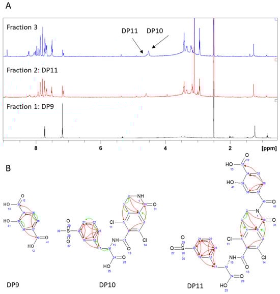 (A) 1H NMR spectra of three fractions resulting from extreme degradation (30% H2O2 for 90 days); and (B) key 1H-13C HMBC interactions (green arrows show 3-bond correlations, red arrows show 4-bond correlations) of identified degradation products.