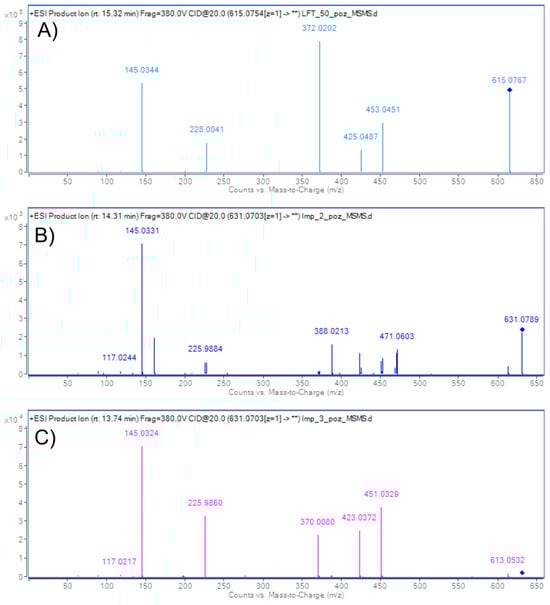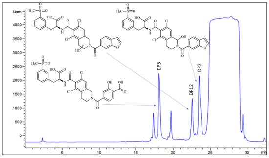 Reluctant to abandon our efforts to fully characterize DP7, we experimented with various degradation conditions and durations, finally converging onto targeted efficiency rather than brute force: 50 mg/ml LIF in aqueous solution with 3% H2O2 for 7 days resulted in a mixture from which three degradation products were isolated by preparative HPLC (Figure 5). To facilitate the comparison with previous MS/MS and HRMS analyses, the three individual compounds were analyzed using exactly the same conditions (Supplementary Materials, Section S5). The isolated amounts were not sufficient for NMR analysis.