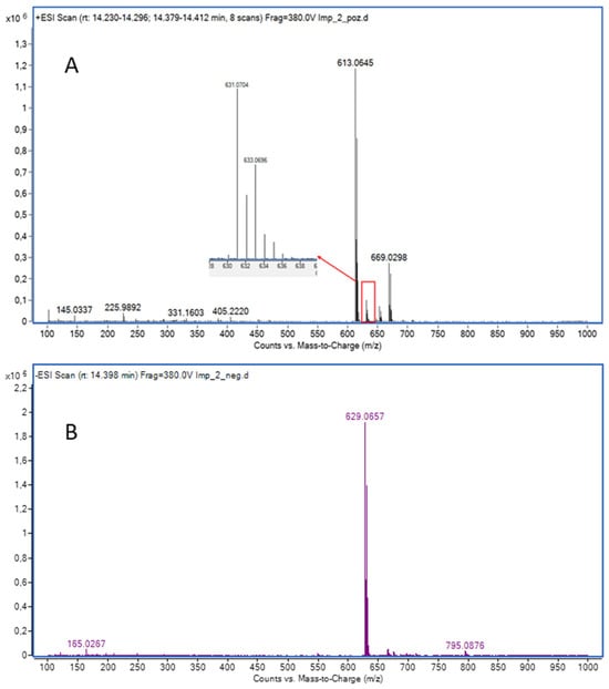Comparing our results to data reported by Kumar et al. [16], the similarities are obvious. They performed MS analysis only in ESI+ mode, yielding m/z 613.0582 which was attributed to a LIF-like molecule featuring a double bond between positions C2 and C3. Their MS/MS analysis of m/z 613.0582 revealed a fragmentation pattern consisting of ions at m/z 423.0322, m/z 225.9817, and m/z 145.1280, matching our pattern in ESI+ for m/z 613 at CE 20 V, which also included m/z 423.0308, m/z 225.9811, and m/z 145.0270. As in their work, when performing analysis in the mixture, we also did not detect the molecular ion in ESI+ mode. However, in both samples we did detect the DP7 molecular ion m/z 629 in ESI− mode; therefore, we are convinced that the observed m/z 613.0621 in ESI+ is an in-source fragment of DP7.