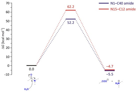Free energy profiles for the neutral hydrolysis of N1–C40 (blue) and N15–C12 (red) amide bonds in LIF, obtained by the (SMD)/B3LYP/Def2TZVPP model in water.
