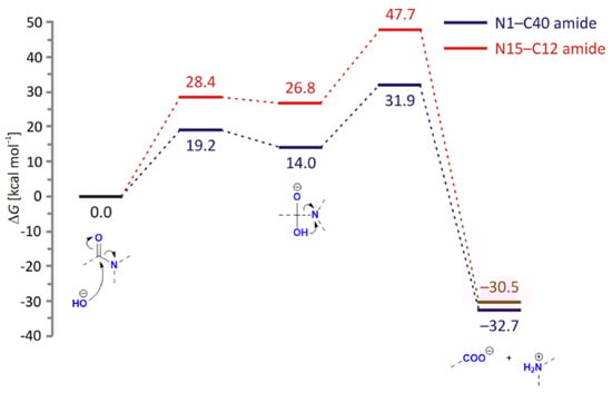 Base-catalyzed hydrolysis features the approaching hydroxyl group, which will, expectedly, facilitate amide hydrolysis due to its higher nucleophilicity over neutral water (Figure 10). Unlike the previous case, here the reaction proceeds in a stepwise fashion, with the first transition state featuring a partly formed C(amide)–O(hydroxyl) bond (1.95 Å for N1–C40, and 1.84 Å for N15–C12). This process is again kinetically more favourable for N1–C40 amide, and in both cases offers the high-energy tetrahedral intermediate, allowing only a few kcals/mol stabilization relative to the preceding transition state. The intermediate breakdown turns rate-limiting, with the overall ΔG‡ = 31.9 kcal/mol (272i cm−1) for N1–C40 largely outperforming ΔG‡ = 47.7 kcal/mol (391i cm−1) for N15–C12 amide. Such a large difference in kinetic requirements eliminates the possibility for the latter process and agrees with the dominance of DP1 and DP2 degradation products, which is further supported by its −2.2 kcal/mol-higher reaction exergonicity.