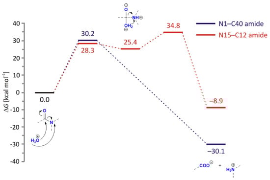 Free energy profiles for the acid-catalyzed hydrolysis of N1–C40 (in blue) and N15–C12 (in red) amide bonds in LIF, obtained using the (SMD)/B3LYP/Def2TZVPP model in water.
