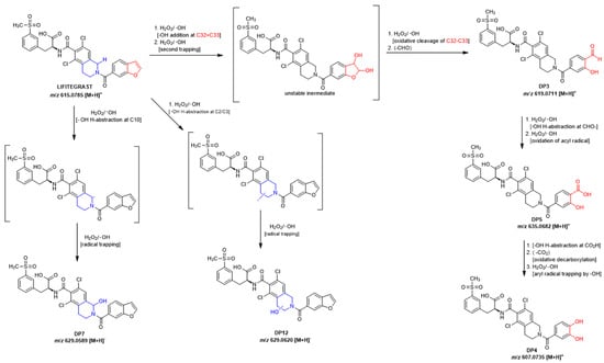 A literature search (SciFinder, 5 August 2025) identified 287 references related to LIF, of which 2 describe the development of analytical methods for quality control [13,15]. However, there is a notable lack of publicly available data concerning its degradation. Only one LIF degradation study has been reported [16] and it involved analysis using chromatography and MS in accordance with ICH Q1A(R2) guidelines. The results of that study (by Kumar et al.) indicate that LIF remains stable in aqueous solution and in solid form under photolytic and thermal stress conditions. In contrast, exposure to alkaline and acidic hydrolysis leads to decomposition into the known products DP1 and DP2 (Figure 1). They also report that oxidative stress results in the formation of another degradation product which they named “DP3”, characterized by a double bond at position C2=C3 in the dichlorotetrahydroisoquinoline (for LIF numbering, see Figure 1). The structure proposed as “DP3” was supported by the observed [M+H]+ 613.0582 and a key fragment ion at 423.0322, corresponding to the loss of the benzofuran carbonyl moiety. In our study, their “DP3” corresponds to the degradation product we identified as DP7, and we suggest that the structure proposed by Kumar et al. should be revised.